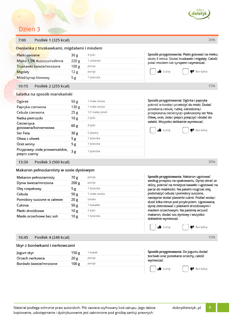 w formie propozycji posiłków (zamiast pojedynczych jadłospisów jednodniowych, przygotowano propozycje kilku propozycji dań na każdy posiłek). Tutaj nie uzależniamy Cię od tego jakie masz np. w danym dniu zjeść śniadanie czy obiad, tylko sam wybierasz sobie ulubione danie z kilku przedstawionych przez nas propozycji.