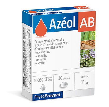 Azeol AB jest suplementem diety opracowanym na bazie oleju z lnicznika siewnego (Camelia sativa) i specjalnej kompozycji olejków eterycznych z eukaliptusa, cynamonu, rozmarynu i nasion marchwi. Zastosowany w produkcji, opatentowany proces Quality Silver, gwarantuje maksymalną jakość i trwałość oleju w okresie przydatności do spożycia.Rekomendowany do suplementacji w: